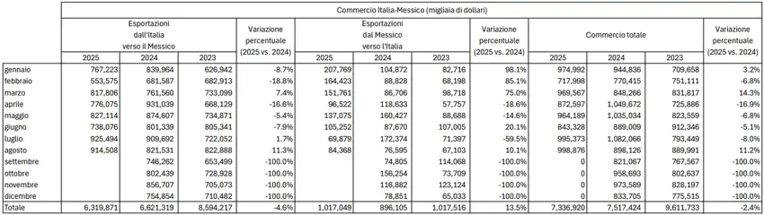 Per l’intero periodo gennaio-agosto, tuttavia, l’interscambio bilaterale totale mostra ancora una leggera flessione (-2,4%). Le esportazioni dell’Italia verso il Messico hanno totalizzato 6,4 miliardi di dollari nei primi otto mesi del 2025 (-4,6% rispetto al 2024), mentre le vendite dalla nazione messicana allo Stivale hanno raggiunto 1,02 miliardi di dollari (+13,5% rispetto allo scorso anno). L’interscambio totale è stato pari a 7,3 miliardi di dollari.