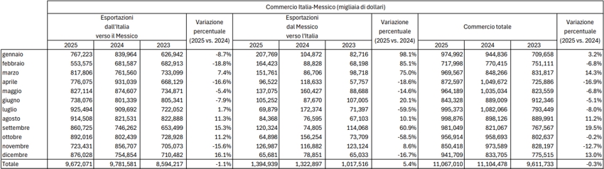 Ore 08.51 – Il 2025 si chiude confermando la solidità delle relazioni commerciali tra Italia e Messico, con un interscambio complessivo che si attesta su cifre che superano gli 11 miliardi di dollari (11,07 miliardi per l’esattezza).