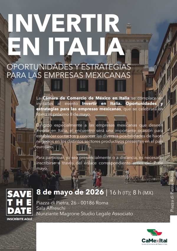 L’incontro si terrà l’8 maggio a Roma ed è rivolto alle realtà aziendali della nazione latinoamericana interessate a esplorare i settori produttivi del Paese europeo. I lavori inizieranno alle ore 16 in Italia (le 8 del mattino in Messico). Sarà possibile assistere di persona presso la Sala Affreschi dello Studio Legale Associato Nunziante Magrone, situato in Piazza di Pietra, oppure a distanza. Le registrazioni sono aperte fino al 7 maggio tramite l’apposito link di iscrizione.