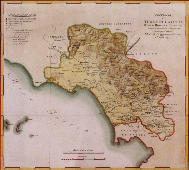 [2] All'indomani dell'Unità, la provincia di Terra di Lavoro era una delle più vaste d'Italia: comprendeva l'intero territorio dell'attuale provincia di Caserta, la parte meridionale dell'attuale provincia di Latina (il circondario di Gaeta), parte dell'attuale provincia di Frosinone (il circondario di Sora), tutta la parte dell'agro nolano compresa nell'attuale provincia di Napoli e ancora una parte delle attuali province di Benevento, Avellino e Isernia.