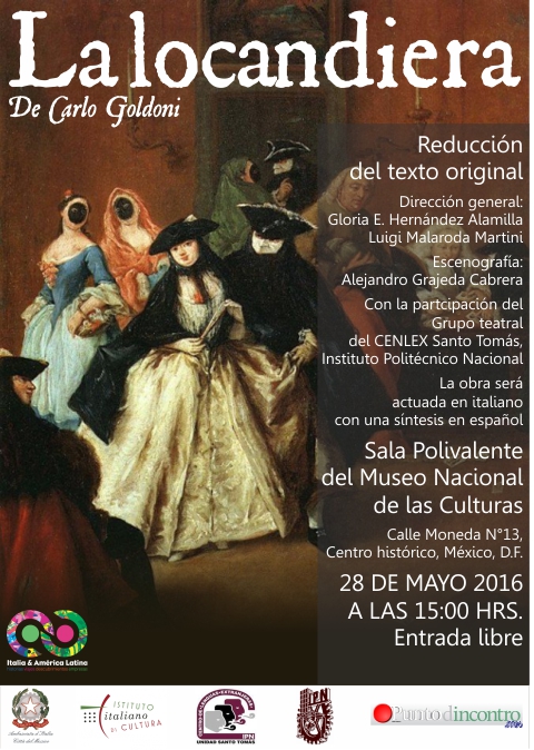 El país de la bota estará presente con un stand y con la representación de una reducción del texto original de la ópera “La Locandiera” de Carlo Goldoni, puesta en escena por el grupo de teatro del CENLEX Santo Tomás, integrado por alumnos de italiano del Centro de Lenguas Extranjeras del Instituto Politécnico Nacional y dirigido por Gloria Hernández y Luigi Malaroda. La representación tendrá lugar el 28 de mayo a las 15:00 hrs. en la Sala Polivalente del Museo Nacional de las Culturas, ubicado en la Calle Moneda N° 13. La entrada será libre.