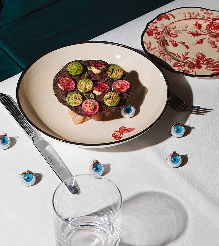 Il mais viola è un gruppo di varietà di Zea mays caratterizzate dai chicchi (i frutti) color porpora. In Messico si trova in diversi tipi, tra cui il nal tel, originario dello Yucatan. È un alimento sano, poiché contiene sostanze fenoliche e antociani, oltre ad altri fitochimici benefici per la salute. La base del piatto è una tostada (una tortilla fritta fino a farla diventare croccante) di mais viola, (che può essere cotta al forno per i clienti che lo richiedono), che viene posta sopra il pesce “bonito” (un tipo di tonno) marinato. Viene poi guarnita con crema di avocado, salsa al chipotle, polvere di ibisco (che aggiunge un tocco di acidità floreale), coriandolo e sottilissime fette di ravanello. Una “tostada al rovescio”, quindi, per permettere ai commensali non messicani di mangiarla con le posate, qualcosa che non si vede mai in terra azteca. Il risultato è comunque un piatto speziato e ricco ad ogni boccone.