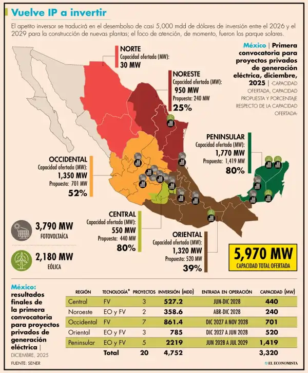 09:46 h - La Secretaría de Energía de México anunció la convocatoria de una segunda licitación dirigida a empresas nacionales e internacionales para proyectos de generación eólica y fotovoltaica en el primer trimestre de 2026.