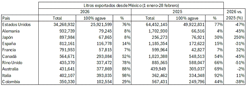 En conjunto, las exportaciones hacia los diez principales países de destino se desplomaron en más de 31.5 millones de litros, pasando de 71.4 millones en los primeros dos meses de 2025 a 39.8 millones en 2026, lo que representa una disminución de aproximadamente el 44%. Esta fuerte caída total está determinada en gran medida por el retroceso de Estados Unidos (-47%).