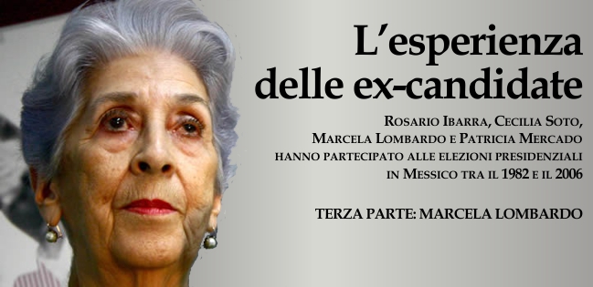 telegiornale di Milenio TV a Marcela Lombardo. Nelle elezioni del 1994, Marcela ottenne un lontano ottavo posto, con soli 166 mila voti con i quali raggiunse un misero 0,47 per cento dei suffragi. Oltre a Zedillo, Fernandez de Cevallos, Cardenas e Soto, fu superata da Jorge González Torres del Partito Verde (PVEM), Rafael Aguilar Talamantes del Partito Cardenista di Ricostruzione Nazionale (PFCRT) e da Álvaro Pérez Trevino, del PARM. Fece peggio di Marcela solo Pablo Emilio Madero, del Partito Democratico Messicano, per cui votarono 87 mila persone (0,28%). E per Josefina Vazquez Mota ha queste parole: - Che cosa consiglierebbe a una candidata alla presidenza di non fare? Ora abbiamo un'altra candidata. Che cosa le direbbe di evitare, secondo la sua esperienza? - Di non limitarsi alle frasi. Di evitare gli slogan. Che dica invece quello che vuole fare. che si basi su un programma di governo, perché le frasi che attirano l'attenzione, pensate solo per conquistare le persone, e che trasmettono l'idea di cambiare la situazione in cui le persone vivono, sono molto negative. Non verranno mantenute le promesse che restano nell'aria, come quella del "presidente dell'occupazione (riferimento a Calderón)", o qualsiasi altra cosa del genere. Così, sempre, quando si avvia una campagna, ci vuole una piattaforma, un programma di governo, soprattutto per i candidati alla presidenza. Questo è molto importante perché in assenza di un programma concreto, si finiscono a fare questi discorsi vuoti, presumibilmente emotivi, ma che piacciono solo alle persone che hanno bisogno di sentire promesse ... È essenziale per un programma ... - E soprattutto che ci spieghino come faranno per metterlo in pratica, no? - Naturalmente. - E invece cosa consiglierebbe di fare a una candidata come Josefina Vázquez Mota? Le consiglierei di avere un atteggiamento normale. L'atteggiamento di una persona che lotta per un ideale politico, che cerca un cambiamento per il Paese e che vuole difendere il Paese. Deve tenere in mente che il Messico, soprattutto ultimamente, ha bisogno di persone che si impegnino a riacquistare l'indipendenza politica e a lottare per l'indipendenza economica del Paese. Questo è molto importante.
