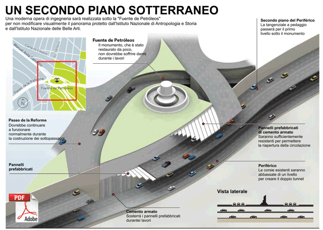 Se construirà así, de acuerdo con el Departamento de Obras Públicas de la capital mexicana, el segundo piso subterráneo del Periferico en la zona de la intersección con el Paseo de la Reforma.