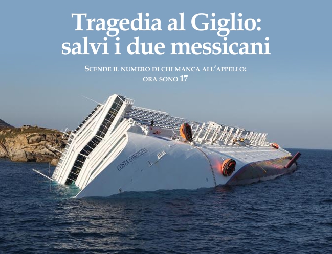 15 de enero de 2012 - Rescatistas luchaban ayer por encontrar a las alrededor de 17 personas que no han sido localizadas tras el naufragio, la noche del viernes, del crucero “Costa Concordia”, frente a la isla de Giglio, en la costa occidental italiana. El capitán del barco se encuentra detenido bajo la acusación de “homicidio culposo” y “abandono de pasajeros”. Tres personas: los turistas franceses Francis Servel y Jeanpierre Micheaud, así como el marinero peruano Tomás Alberto Costilla Mendoza, murieron ahogados, según el último reporte. Hay también unos 40 heridos, dos de ellos de gravedad. Una pareja coreana, que iba en el barco como parte de su luna de miel, fue rescatada del interior por un comando especial, cuando en la zona era ya domingo. En el crucero, el más grande de Italia, viajaban cuatro mil 229 personas, de las cuales 107 eran de países latinoamericanos, incluyendo dos mexicanos, los cuales ya fueron localizados, sanos y salvos, según confirmó el embajador de México en Italia, Miguel Ruiz-Cabañas Izquierdo. La pareja, originaria de Guadalajara, ya fue trasladada a Roma y viajará a México en los próximos días..