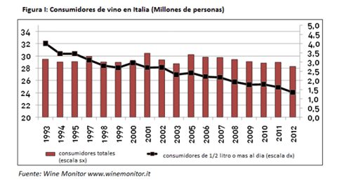 En el 2012 el consumo de vino en Italia descendió hasta 2,260 millones de