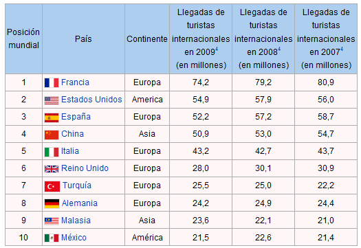 20 de mayo de 2011. - Los destinos preferidos por los turistas en el mundo (numero de visitantes extranjeros en cada país): en 2007, Francia recibió 82 millones de personas, España 59, Los Estados Unidos 56, China 55, Italia 44, el Reino Unido 31 y Alemania 24.