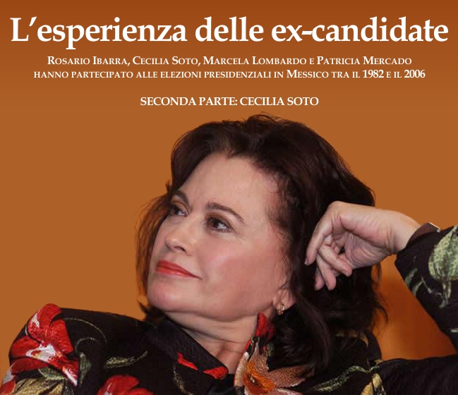 PARTE: CECILIA SOTO 27 febbraio 2012 - Cecilia Soto è stata la seconda candidata presidenziale in Messico. Sei anni dopo l'ultimo tentativo di Rosario Ibarra, nel 1994. Nata nello Stato di Sonora e laureata in fisica all'Università Nazionale Autonoma del Messico (UNAM), partecipò rappresentando il Partito del Lavoro (Partido del Trabajo, PT). Ma aveva già esperienza politica: è stata membro del Congresso dello Stato di Sonora nel 1988 e deputato federale nel 1991 in rappresentanza dell'oggi estinto PARM. Nel 2000 si avvicinò a Vicente Fox e al PAN, e durante la presidenza di Fox fu nominata ambasciatore in Brasile. Cecilia Soto —che attualmente collabora con la Fondazione Carlos Slim— ha ottenuto il miglior risultato tra le donne che fino al 2006 sono state candidate alla presidenza, con il 2,75 per cento dei voti. Votarono per lei quasi un milione di persone (970.121), più del doppio del miglior risultato raggiunto, prima di lei, da Rosario Ibarra nel 1982. In quelle elezioni, segnate dalla tragedia dell'assassinio del candidato del PRI alla presidenza Luis Donaldo Colosio, il PRI vinse, comunque, con il candidato sostituto Ernesto Zedillo, che raggiunse 17,1 milioni di suffragi, il numero più alto con il quale finora è stato eletto un Presidente, anche se percentualmente —fino ad allora—, la cifra rappresentò il risultato più basso per il PRI: 48,69%. Al secondo posto, Diego Fernández de Cevallos (PAN) con 9,1 milioni di voti (25,92%). Cárdenas ottenne il terzo posto con 5,8 milioni di voti (16,59%). Al quarto posto, Cecilia Soto.