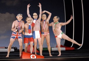 Carsen ha rifatto Bernstein aggiornando l’aggiornamento a oggi. E, a domanda, rispondendo che Berlusconi, Chirac e Blair sono appunto degli ex potenti e Bush e Putin lo saranno presto, a mandato concluso (il che spiega, fra l’altro, perché in scena ci sia Berlusconi e non Prodi). Ora, lo spettacolo di Carsen, peraltro efficacissimo e assai divertente, ha debuttato l’11 dicembre scorso al Théâtre du Châtelet di Parigi. Il giornale che state tenendo in mano in questo momento raccontò che un’opera prossima ventura alla Scala avrebbe messo in scena Berlusconi in mutande tricolori, il che è sicuramente legittimo ma, altrettanto sicuramente, fa notizia. E infatti seguirono giorni di passione e di telefonini roventi: mentre la stampa di parte berlusconiana tempestava, la Scala prima annunciò, con un secchissimo comunicato di 5-righe-5, che la produzione era annullata in quanto «non in linea con la programmazione artistica», poi ci ripensò e il sovrintendente Stéphane Lissner rilasciò abili interviste per dire che il Candide si sarebbe fatto ma, appunto, previe modifiche. Il problema, beninteso, non erano i cinque minuti di Berlusconi (che peraltro non ha mai commentato e tantomeno protestato), ma «l’impianto generale dello spettacolo», eccetera.
