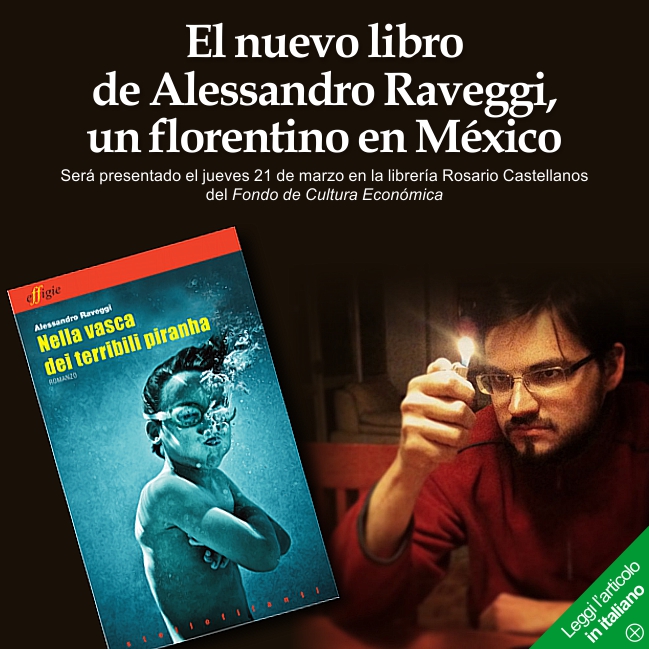 10 de marzo de 2013 - Nella vasca dei terribili piranha (En la tina de las terribles pirañas, Effigie, 2012) es la primera novela de Alessandro Raveggi, nacido en Florencia, Italia, autor de ensayos y poesía y actualmente residente en México. Como explica el propio Raveggi, la novela tuvo una larga gestación: la primera idea se remonta unos diez años atrás, cuando, observando desde Granada la llegada de los inmigrantes a las costas españolas, y leyendo paralelamente The submariner (un cómic de Marvel), tuvo la inspiración que dio origen a la narración. El libro será presentado el jueves 21 de marzo a las 18:30 en la Libreria Rosario Castellanos (Fondo de Cultura Económica) de la Ciudad de México y estará disponible en la capital mexicana en la librería Morgana de la Colonia Roma. Un enigmático muchacho anfibio, atravesando identidades y trabajos inhumanos, se extiende como una leyenda urbana. Una leyenda que, tal vez, tiene orígenes antiguos: ¿Se trata, acaso, del mitológico hombre-pez que resurge con frecuencia desde la más temprana historia de la humanidad? Esta novela picaresca narra desde diferentes puntos de vista la aventura en Europa de este Colapesce [1] extranjero. Una aventura que lo llevará a trabajar como stripper surrealista en París, deseado por la cuarentona Carolina y acechado por una secta de actrices jubiladas. Se convertirá también en promotor involuntario, en Berlín, de Vittorio Buono, astuto manger romano de niños prodigio. Por último, dirigirá una revuelta de ilegales —en medio de una nueva inundación [2]— en Florencia, donde su camino se cruzará con el del diminuto nerd Alfredo, de regreso de un Erasmus [3] transcurrido en forma desganada perfeccionando el proyecto de una máquina profética que pueda eliminar la apatía de los italianos. ¿Quiénes serán los ganadores y los perdedores del gran final abismal en Italia, después de viajar con el lector entre las Islas Canarias, España, Europa Central, Escandinavia y México? _______________ [1] La leyenda de Colapesce se basa en una historia siciliana con muchas variantes, cuyos primeras versiones se remontan al siglo XIV. En su versión más popular, el protagonista es un tal Nicolás (Cola de Messina), hijo de un pescador, apodado Colapesce por su habilidad para moverse en el agua. [2] El 4 de noviembre de 1966, después de dos días de lluvia intensa y continua, el río Arno se desbordó e inundó la capital de Toscana al amanecer. [3] El programa Easmus apoya y facilita la movilidad académica de los estudiantes y profesores universitarios dentro de los países miembros de la Unión Europea.
