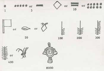 Così, ad esempio, "XVI" significava dieci più cinque più uno, cioè sedici, mentre "IV" significava cinque meno uno, cioè quattro. Vale, comunque, la pena di accennare anche ai sistemi di numerazioni di alcune altre civiltà extra-europee. Per anni i ricercatori si sono arrovellati per decodificare il sistema numerico degli Aztechi, fatto di punti, frecce e figure geometriche. Il sistema numerico azteco è vigesimale, cioè con base 20 e si compone di una serie di simboli geometrici. Il punto equivale a 1, una barretta a 5, un rombo a 10 e così via.