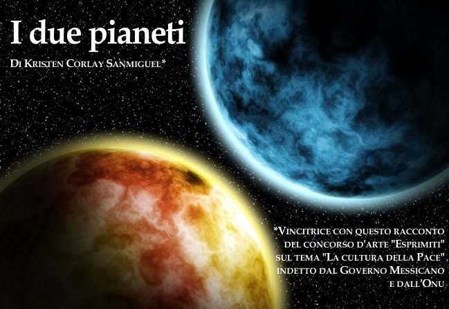 il Comandante Zeth che immediatamente ricominciò a litigare. Si rivolse subito ai gemelli Ana Paula e Roger. Ana Paula e Roger avevano 12 anni ed erano totalmente uguali eccetto il colore degli occhi. Roger invece di averli verdi come Ana Paula li aveva azzurri ma per il resto erano uguali; i due avevano i capelli castani come la terra e tutti e due erano molto alti. Ana Paula voleva visitare altri pianeti e scrivere le sue avventure nel suo quaderno. Roger voleva diventare astronomo come il Capitano Sánchez e conoscere l’universo a memoria. I due erano molto emozionati per la missione planetaria. Dieci minuti dopo stavano già preparando le valige. «Io porterò il mio quaderno e l’astuccio con il materiale necessario per scrivere, voglio scrivere le nostre avventure nel mio quaderno». «Sarà la migliore spedizione! E la cosa più bella è che sarà in un altro Pianeta!» esclamò Ana Paula molto emozionata. Io porterò il mio telescopio e il mio atlante stellare. Sarà emozionante imparare da un altro Pianeta anche se il suo nome non mi piace affatto. «Il Pianeta della Guerra» che nome orribile! disse Roger ancora emozionato ma indeciso sui vestiti da indossare. «Secondo me dovresti portare i pantaloni neri con la «guayabera» bianca, è una buona combinazione per la domenica. Inoltre non sappiamo come si vestono là. Può darsi che siano molto formali. Io ti chiedo dirispettare il loro nome. Lo so che è orribile ma dobbiamo essere educati non importa quello che succede» disse Ana Paula molto indaffarata a preparare le valige. Si, hai ragione disse Roger, anche lui con molta fretta. 10, 9, 8, 7, 6, 5, 4, 3, 2, 1 DECOLLO! Urlarono per la seconda volta gli abitanti del Pianeta della Pace – Ana Paula, Roger e il Capitano Sánchez furono lanciati allo spazio. La nave scese nel Pianeta della Guerra. Gli abitanti si arrabbiarono vedendo che era la nave del Capitano Sánchez e si arrabbiarono ancora di più quando videro che con il Capitano c’erano anche Ana Paula e Roger «Buona sera, amici del Pianeta della Guerra. Sono Roger e lei è mia sorella Ana Paula». «Veniamo per una spedizione nel vostro pianeta» disse Roger come se avesse recitato quelle frasi davanti allo specchio tutta la vita. «Questi sono i tuoi migliori discepoli di astronomia? Sono bambini». Disse il Comandante Zeth, ridendo «Si sono i migliori e rimarranno qui una settimana, trattateli come trattate i vostri bambini». Disse il Capitano Sánchez congedandosi. Salì sulla nave e Ana Paula e Roger videro il loro idolo scomparire nello spazio. Il Comandante Zeth li portò da Raul, uno specialista nel controllo di piaghe!. –Se ti chiedi «Perchè uno specialista nel controllo di piaghe? La risposta è che Ana Paula e Roger sarebbbero stati considerati una piaga per il Pianeta della Guerra- Ana Paula e Roger avevano letti duri come una pietra nella loro piccola stanza e non avevano cuscini. Non solo dormivano male, di giorno era ancora peggio. Nessuno diceva per favore né grazie. Raul dava loro solo un pezzo di pane e mezzo bicchiere d’acqua ognuno e mangiavano solo due volte al giorno. A metà della settimana i gemelli non avevano voglia di rimanere né un giorno in più. Il giorno seguente un vecchietto perse una moneta per la strada e Roger la raccolse e gliela diede. Il vecchietto non disse nemmeno grazie e continuò a camminare per la sua strada. Ma in cuor suo si sentì molto male per non aver detto grazie. E volle anche lui fare qualcosa per un’altra persona; raccolse la borsa di una signora e gliela diede, ma la signora non disse grazie. Anche lei si sentì male come il vecchietto e volle fare qualcosa per un’altra persona. A poco a poco tutti ricevettero e fecero un favore a un’altra persona. Persino il Comandante Zeth fece un favore. A poco a poco cominciarono anche a dire grazie e per favore. Quando ritornò il Capitano Sánchez vivevano già tutti in pace come nel Pianeta della Pace. Ana Paula e Roger erano felici e orgogliosi. Il Pianeta della Pace e il Pianeta della Guerra che cambiò il suo nome con quello di «Il Pianeta dei Favori» diventarono degli ottimi amici. E ogni 21 settembre i due pianeti si riuniscono per celebrare il giorno della pace che è il giorno in cui Ana Paula e Roger arrivarono al Pianeta della Guerra. I due Pianeti costruiscono «aquiloni» e li fanno volare nella speranza che un altro pianeta faccia la pace. Un pianeta chiamato Terra ricevete il messaggio ed è per questo che il 21 settembre celebra il giorno della pace. Ve lo racconto perché se vedete un aquilone volare sappiate che sta volando per andare a finire in uno dei pianeti che hanno la missione di fare la pace.