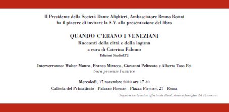 16 novembre 2010. - Sarà presentato mercoledì 17 novembre prossimo alle ore 17.30 a Roma, presso la sede della Società Dante Alighieri (Palazzo Firenze, piazza Firenze 27), il libro di Caterina Falomo, Quando c’erano i veneziani. Racconti della città e della laguna (Edizioni StudioLT2). All’incontro interverranno Walter Mauro, giornalista e scrittore, Franco Miracco, portavoce del Ministro delle Politiche Agricole, Giovanni Pelizzato, editore StudioLT2, e Alberto Toso Fei, scrittore ed esperto di storia veneziana.
