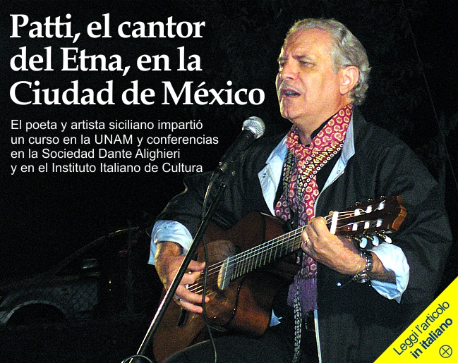 Alfio Patti. 17 dicembre de 2012 - Extraordinario éxito en la ciudad de México para “el cantor del Etna”, Alfio Patti, que contribuyó significativamente al incremento del interés local por la poesía regional italiana. Como Punto d'incontro online ya había anunciado el pasado 11 de octubre, estudiantes de la Universidad Nacional Autónoma de México (UNAM), Departamento de Letras Italianas de la Cátedra Extraordinaria Italo Calvino, siguieron con interés y participación las clases que el escritor, estudioso y apasionado de la poesía siciliana impartió en Ciudad Universitaria —el campus principal de la UNAM— en el contexto de un curso titulado “Allakatalla, cuando la palabra se hace poesía y la poesía canto”.