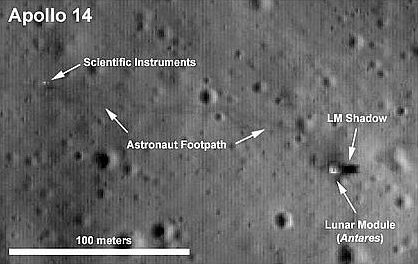 Nella foto della Nasa (vedi sotto) ecco i «rifiuti» dell'Apollo 14: il modulo lunare, le impronte degli astronauti(Astronaut footpath) dal modulo (Antares) agli strumenti scientifici (Scientific Instruments), anch'essi rimasti lì. Se non altro sono prove contro le tesi «negazioniste».