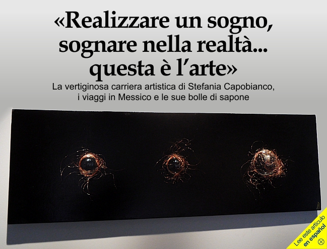Stefania Capobianco. Eclipse. 20 de noviembre de 2012 - Stefania Capobianco cree en el arte, y sus obras son el resultado de esta fe. El tema recurrente en ellas son las pompas de jabón que recuerdan la ligereza y la infancia, el deseo de volver a ser niños y —con imaginación— seguir soñando. Nació como artista apenas en 2009 y con sus trabajos —técnicas mixtas sobre tela utilizando diferentes materiales— logra expresar y comunicar sentimientos y experiencias de vida. Está siempre en busca de nuevos materiales, estímulos y emociones para crear y, por esto, a menudo visita tierras lejanas. En Japón pudo confirmar, a través de la comparación con artistas locales, el gran trabajo que está realizando, mientras que en la Ciudad de México —impulsada por el deseo de conocer los lugares en donde nació Frida Kahlo— ha admirado en persona el arte mexicano, que la impactò al punto de programar un segundo viaje para diciembre de este año. Su primera exposición colectiva —la ocasión para mostrar, por fin, su trabajo a un público amplio— fue en 2011. Luego, en marzo de 2012, su primera muestra personal en la ciudad donde nació, Brescia. A partir de ahí comenzó el ascenso vertiginoso: en junio de 2012 una pequeña exposición en la galería de arte La Telaccia de Turín, seguida, en julio, por su participación en la Bienal de Monte Carlo que se llevó a cabo en las prestigiosas salas del Hotel de París. En septiembre en el Palacio Zenobio de Venecia expuso 4 obras en el evento Visiones en blanco y negro, pensamientos a colores. A partir del pasado 20 de octubre siete obras suyas se exponen en el Museo Magma de Caserta y —del 10 de enero al 4 de febrero del próximo año— participarà como artista en la Bienal de Palermo, que será inaugurada por Vittorio Sgarbi. En febrero, además, presentará sus obras en la Feria Dell'Arte de Innsbruck.
