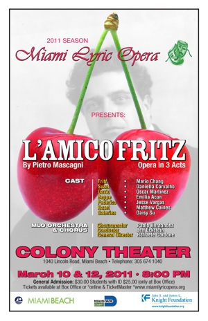 Después de su éxito histórico con la Cavalleria Rusticana, Mascagni decidió componer una ópera basada en una historia menos dramática ambientada en un pueblo judio de Alsacia en el siglo XIX. Este cambio de estilo confirmó la inspiración operística de Mascagni así como las ricas melodías que han marcado su música. L'amico Fritz está siendo representada con más frecuencia en Italia y ha sido recientemente redescubierta en las Américas. La Compañía Miami Lyric Opera (MLO) quiere rendir homenaje al último de los grandes compositores de la ópera italiana, presentando en Miami —por primera vez— esta obra maravillosa.