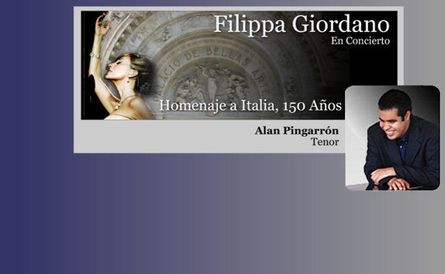 Una voz privilegiada che canta las más hermosas canciones de la música popular italiana y mexicana y algunas de las arias más conocidas de la música operística, Filippa Giordano, y la voz del joven tenor Alan Pingarrón, ex alumno de la dante, cuyo talento seguramente será aplaudido en todo el mundo, han sido los artistas invitados por la Sociedad Dante Alighieri de la Ciudad de México para rendirle un homenaje a Italia con motivo de sus 150 años de vida como País unido. Filippa ha heredado de sus padres y de la hermosa isla de Sicilia que la vio nacer la pasión por la ópera y una bella voz cuya calidez refleja el encanto del Mediterráneo que abraza a la bella isla que fuera la cuna de la magna Grecia y a Italia toda. Pero su voz encierra también los colores mágicos y la calidez del caribe mexicano que se reflejan en la mirada de sus ojos de mujer carismática y encantadora que camina con alegría por los senderos de la vida regalando el color y la calidez de su voz que nace en su corazón como un regalo de amor para toda la gente que la admira y la escucha todos los días en todo el mundo.