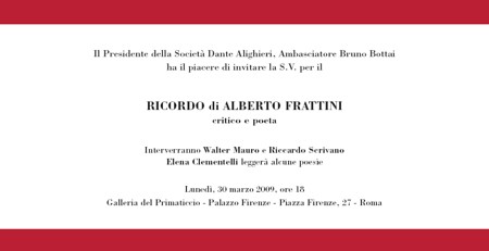 26 marzo 2009.- Critico, poeta, professore universitario, persona di grande umanità e uomo di cultura in grado di coniugare la creatività della produzione poetica con la costante ricerca filologica e l’impegno accademico. Tutto questo è stato Alberto Frattini, personaggio di spicco della cultura italiana al quale la Società Dante Alighieri dedicherà un ricordo speciale lunedì 30 marzo prossimo a partire dalle ore 18 in Palazzo Firenze a Roma (piazza Firenze 27).