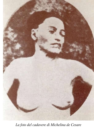 De una de estas mujeres, Michelina De Cesare (1841-1868) quedan tres fotografías: en dos de ellas aparece a la edad de veintiún años, valiente y hermosa, vistiendo el traje elegante de los campesinos de su país (¡y armada con un rifle y una pistola!). La tercera muestra su imagen, desnuda hasta la mitad del torso. La joven muerta a causa de las atroces torturas sufridas, fue desnudada y fotografiada antes de ser expuesta en la plaza del pueblo como una advertencia a las poblaciones "liberadas".