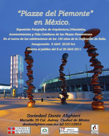 8 aprile 2011. - La mostra “Piazze del Piemonte” —che sarà inaugurata oggi alle ore 20 presso la sede della Società Dante Alighieri di Città del Messico— intende illustrare le piazze piemontesi che rivestono una particolare importanza per il Piemonte, dove i Comuni sono numerosi e l’attività commerciale e culturale di ogni centro abitato trova nella piazza il proprio luogo d’elezione.