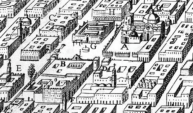 Il Zocalo (Piazza della Repubblica) di Città del Messico nel 1760, secondo il piano di Carlos Lopez di Troncoso successivamente inciso da Diego Franco. La Cattedrale sembra avere solo una delle torri in costruzione ed è contrassegnata con la lettera "A". La lettera "B" rappresenta il palazzo del vicerè —oggi Palazzo Nazionale— e la lettera "C" il Palazzo del Cabildo, oggi sede del governo della capitale.