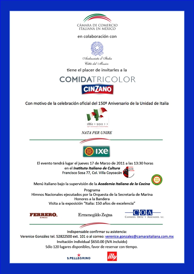 In vista di questa importantissima ricorrenza, la Camera in collaborazione con l'Ambasciata, organizzerá una "Comida Tricolor" presso l'Istituto Italiano di Cultura di Coyoacán, alla presenza della nostra comunitá imprenditoriale ed istituzionale in Messico.