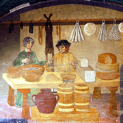 sul cui banco si nota una pila di formaggi