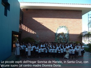 Nel 1997 un’altra grande struttura nasce a Santa Cruz. Costruita in un solo anno, sorge l’Hogar Sonrisa de Mariele, in ricordo di Mariele Ventre, l’indimenticabile Maestra del Coro dell’Antoniano di Bologna, grazie ai fondi raccolti dal “39° Zecchino d’Oro” e da altri benefattori dall’Abruzzo e dal resto d’Italia. E’ un complesso imponente, disposto su un’area di tre ettari, con strutture moderne ed un’organizzazione perfetta. Ospita 130 bambine e ragazze “interne”, che frequentano l’annesso sistema scolastico riconosciuto dallo Stato, dall’istruzione materna alla superiore, aperto anche a frequenze esterne, 800 gli alunni. Campi sportivi, piscina, palestre e laboratori corredano le strutture, alle quali con perizia sovrintende madre Diomira Doria - tenace abruzzese di Sulmona, dal 1986 una pioniera nel Paese - insieme a sei suore boliviane (le hermanas Teodora, Florinda, Zulma, Laura, Sandra e Asteria), che insegnano e coordinano il personale esterno, quaranta tra docenti ed ausiliari. Tra qualche mese le madrecitas della Dottrina Cristiana apriranno un’altra casa in Bolivia, nella città di Cochabamba. Dal 1995 la Congregazione ha attivato una missione anche in Africa, nel Congo francese. C’è una bella fioritura di aiuti dall’Italia, per sostenere la crescita sociale ed umana delle giovani ospiti boliviane negli Hogar delle Missionarie della Dottrina Cristiana, con le adozioni a distanza. Una forma diretta di solidarietà davvero efficace che porta a conoscere da vicino le povertà del mondo, senza sbrigativi scarichi di coscienza cui sono abituate le società opulente, alle quali dà fastidio la visione della sofferenza. E’ poi un valido supporto a queste religiose, da tutti apprezzate e rispettate in Bolivia, alle quali non manca mai il sorriso e le cui giornate di lavoro non conoscono soste. In loro, infine, riconosco con orgoglio la tenacia e la determinazione tipiche dell’indole abruzzese, anche in coloro che in Abruzzo hanno solo realizzato la propria formazione religiosa, ricevendo comunque di quell’indole l’imprinting. Dunque una bella comunità abruzzese in terra boliviana, di recente arricchitasi con l’arrivo di Mons. Luciano Suriani, Nunzio apostolico in Bolivia. Nato ad Atessa, in provincia di Chieti, Mons. Suriani è Vescovo di Amiternum, l’antica diocesi della città sabina - patria di Caio Crispo Sallustio, grande storico romano - situata poco distante dal luogo dove molti secoli dopo sarebbe stata fondata L’Aquila.