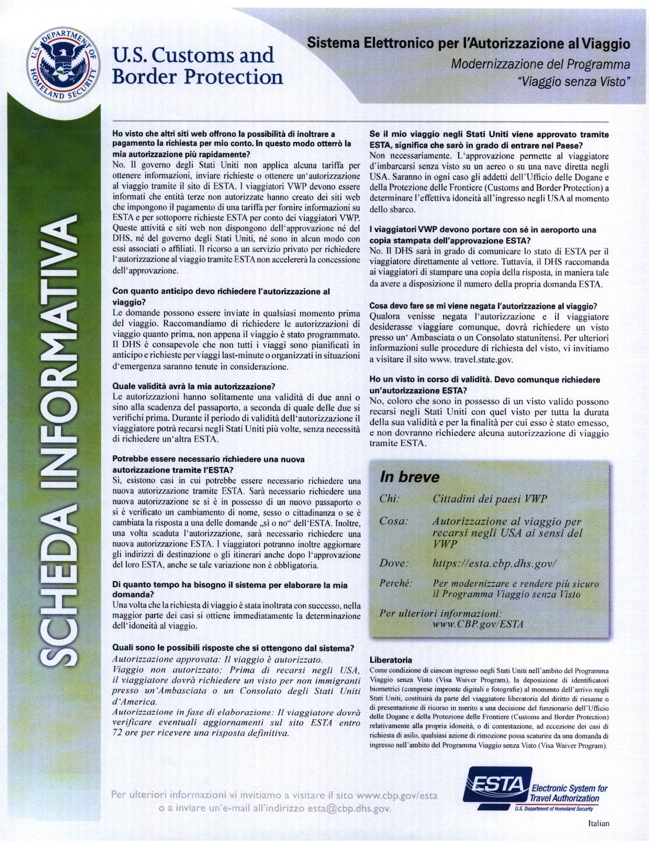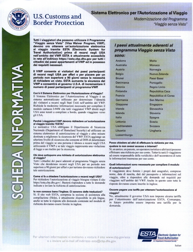 22 febbraio 2010. - I viaggiatori stranieri che intendono viaggiare negli Stati Uniti nell'ambito del Programma Viaggio senza Visto (Visa Waiver Program) sono ora soggetti a requisiti di sicurezza più severi. Tutte le persone idonee che desiderino viaggiare nell’ambito del Programma Viaggio senza Visto (Visa Waiver Program) devono richiedere un’autorizzazione.