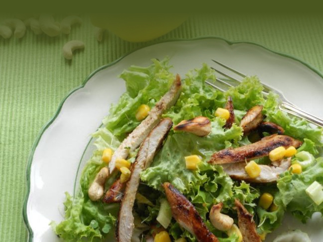 Ingredienti (per 2 persone): lattuga riccia 140 g, un petto di pollo, mais lessato in scatola 80 g, un cuore di sedano, 1 limone, 8 anacardi, salsa di soia, olio extravergine di oliva, sale.