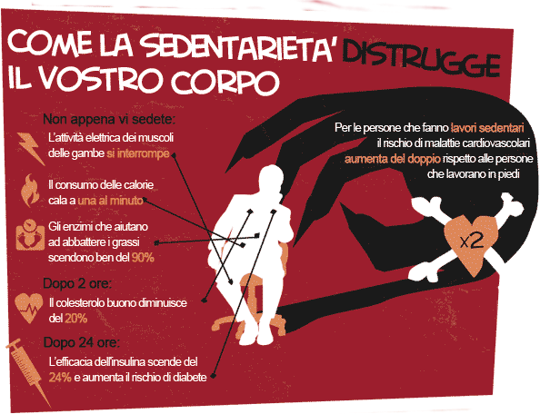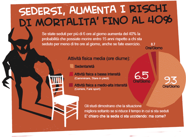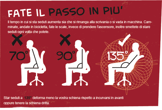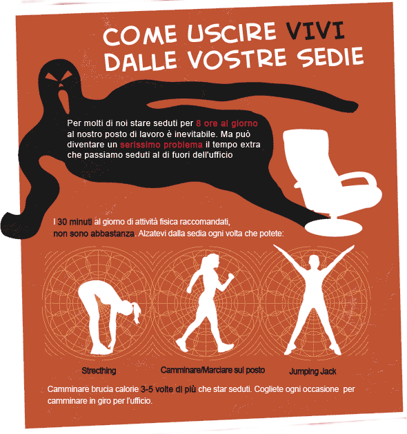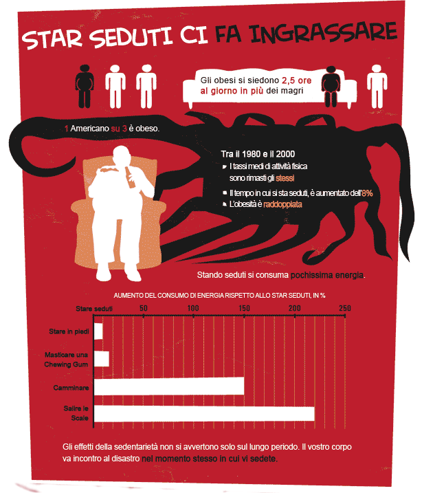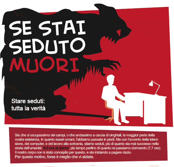 Noi ve la presentiamo opportunamente tradotta: apprenderete che tre ore di televisione spaparanzati sul divano annullano qualsivoglia fatica in palestra. Che mentre sudiamo alla scrivania, il nostro corpo è inerte. E che se proprio siamo costretti a non muoverci, perchè il nostro lavoro ce lo impone, alzarsi anche per un minuto e farsi il periplo dell'ufficio, aiuta. Perchè chi si siede è perduto.