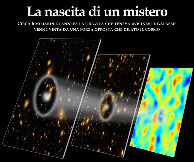 31 marzo 2012 - Circa 6 miliardi di anni fa, a metà strada tra il Big Bang e oggi, l'universo subì la «spinta» da parte di un'energia di cui non si è ancora compresa la natura (infatti è chiamata «energia oscura») che fece rapidamente aumentare la sua velocità di espansione. Ora un gruppo di scienziati è riuscito a «fissare» il momento in cui l'energia oscura ha superato la forza di gravità che teneva unite (in senso relativo) le prime galassie. Il risultato sarà pubblicato sulla rivista Monthly Notices of the Royal Astronomical Society, ed è stato ottenuta dalla ricerca Baryon Oscillation Spectroscopic Survey (Boss) con il telescopio Sloan in New Mexico, coordinata dai ricercatori americani del Lawrence Berkeley National Laboratory. ESPANSIONE - Gli scienziati hanno ricostruito la storia dettagliata dell'espansione dell'universo mappando in tre dimensioni ammassi di galassie lontane, che comprendono 327.349 galassie. Il lavoro ha permesso di calcolare la precisa distanza di questi oggetti, l'età dell'universo a quelle distanze e quanto velocemente l'universo si è espanso in quel momento. «Abbiamo eseguito misure di precisione relative alle strutture a grande scala dell'universo in un periodo compreso fra 5 e 7 miliardi di anni fa», ha osservato il coordinatore del lavoro, David Schlegel. La spinta iniziale dell'energia oscura - che compone il 70% dell'universo - si sarebbe manifestata intorno a 6 miliardi di anni fa. Fino a quel momento l'universo si stava espandendo molto lentamente a causa dalla reciproca attrazione gravitazionale esercitata dalla materia stessa dell'universo. Anche se limitata, l'espansione arrivò un punto critico in cui la densità diminuì a un livello in cui la forza oscura che premeva in direzione dell'espansione superò la gravità, che invece spingeva in direzione opposta. ACCELERAZIONE - L'accelerazione dell'espansione dell'universo è stata annunciata solo 14 anni fa, una scoperta che è stata premiata lo scorso anno con il Nobel per la fisica a Saul Perlmutter, Brian Schmidt e Adam Riess.
