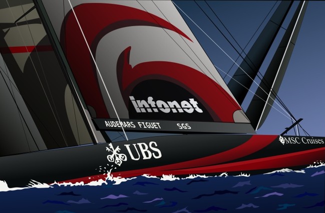 Poiché il regolamento stabilisce che lo yacht deve essere costruito e assemblato nel Paese d'origine, il nuovo scafo svizzero è stato trasportato da Villeneuve a Genova appeso ad un elicottero russo Mi26. Lo sfidante è l'Americano Oracle di proprietá di Larry Ellison. Per la cronaca, le caratteristiche dei due catamarani sono: Alinghi: peso 14 ton. lunghezza 30 m. larghezza 25.5 m. altezza dell'albero 52 m. superficie velica 1.300 mq. equipaggio 15 persone, velocitá max. 35 nodi.