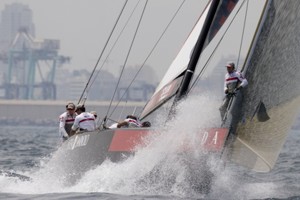 VALENCIA, 14 maggio 2007. - La prima delle regate di semifinale contro BMW Oracle Racing prende il via in condizioni di instabilità del vento in intensità e direzione. Raffiche a 18 nodi da ovest - sud ovest e sole sul campo Romeo (nord). Spithill ha il vantaggio della destra ma Dickson riesce ad annullarlo scivolandogli oltre la prua per andare a navigare tra le barche degli spettatori nell'angolo in basso a destra del box. USA 98 tiene le distanze da Luna Rossa e riesce a mantenere il sopravvento sulla linea di partenza. Luna Rossa esce in vantaggio dai primi due bordi e si separa verso la sinistra andando a concretizzare un vantaggio di 52 secondi sugli avversari alla prima boa grazie a una buona lettura del campo.