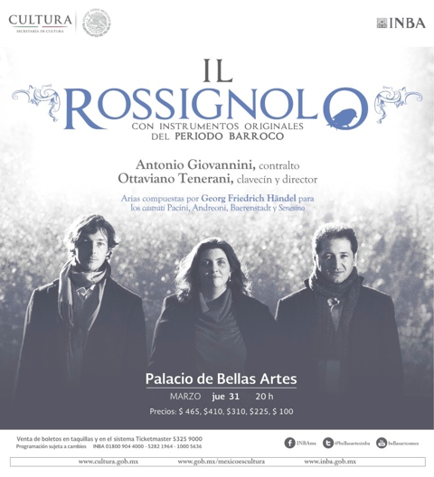 de marzo de 2016 - Il Rossignolo, grupo italiano que los críticos internacionales definen como uno de los más brillantes y rigurosos de la música barroca, hará su debut en el Palacio de Bellas Artes en la Ciudad de México el 31 de marzo con el programa “Händel y los Castrati toscanos”.