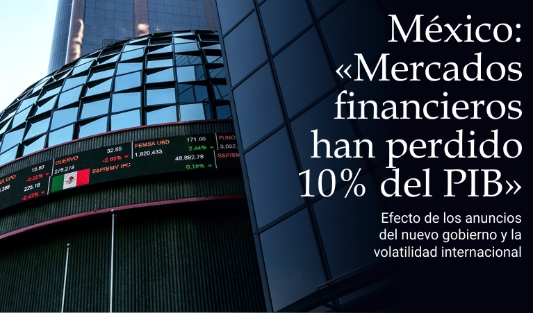 14 de diciembre de 2018 - En los últimos dos meses, algunos de los anuncios del nuevo gobierno encabezado por el presidente Andrés Manuel López Obrador han provocado una pérdida de valor en acciones y bonos que se negocian en el mercado mexicano de aproximadamente 2 billones de pesos, equivalente al 10% del producto interno bruto del país, según declaraciones del presidente de la Casa de Bolsa Bursamétrica, Ernesto O’Farril Santoscoy, publicadas hoy en el periódico La Jornada. Las medidas que han sido las principales causantes de este desplome, según O'Farril, son la cancelación del Nuevo Aeropuerto Internacional de México (NAIM), la iniciativa de regulación de las comisiones bancarias y las modificaciones propuestas al sistema de gestión de fondos de pensión. El directivo estimó que la pérdida de valor de mercado de los bonos gubernamentales y corporativos representa 60 por ciento total, mientras el restante 40 por ciento corresponde al mercado accionario. La volatilidad interna estuvo acompañada de factores externos, entre los cuales resaltan la posible desaceleración económica a escala mundial, la guerra comercial entre Estados Unidos y China, el Brexit y la pugna entre el gobierno de Italia y la Ue por el déficit presupuestal. (massimo barzizza / puntodincontro.mx)