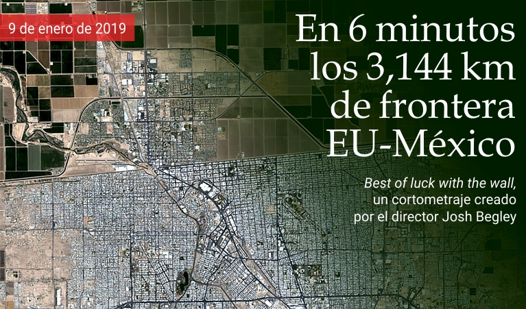 La película, titulada Best of luck with the wall (La mejor de las suertes con el muro), fue realizada y estrenada en 2016 durante la campaña presidencial de los Estados Unidos, y dura solo 6 minutos y 41 segundos. Creada por el director Josh Begley, consiste en la yuxtaposición de 200 mil imágenes satelitales de la frontera entre Estados Unidos y México, desde las playas del Pacífico hasta las olas del Golfo de México, vistas desde el cielo virtual de Google Maps. En total, son 1,954 millas, es decir, 3,144 kilómetros. Best of luck with the wall fluye a lo largo de la frontera entre desiertos ardientes, campos irrigados y ciudades. Muestra sitios donde la frontera es una barrera contra la cual empujan las casas y edificios de México, y otros, en cambio, donde es un río con formas serpenteantes. Entrevistado por Eric Hynes unos días antes de la victoria de Trump en noviembre de 2016, Begley dijo: «... con el ascenso de the Donald, [la frontera] ya no es ni siquiera un concepto geográfico. El espacio que ocupa se ha reducido a una metáfora. La simplicidad de [esta película] reside en insistir en esta geografía y en mostrar el vasto paisaje que se ha transformado en un discurso sobre la construcción de un muro». (massimo barzizza / puntodincontro.mx)
