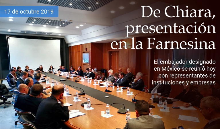 17 de octubre de 2019 - El embajador designado en México, Luigi De Chiara, se reunió hoy en el Palazzo della Farnesina con representantes de varios ministerios y de las principales empresas italianas con intereses en el país latinoamericano para una reunión de presentación en preparación para su misión, que comenzará el 28 de octubre. «Fue un útil intercambio de ideas», escribió la Embajada de Italia en la Ciudad de México comentando la noticia en Twitter.