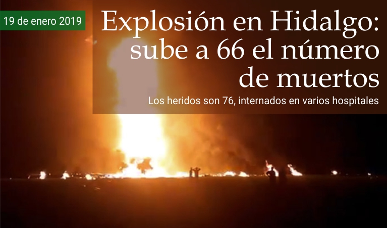 19 de enero de 2019 - El gobernador de Hidalgo, Omar Fayad, informó que hasta el momento el saldo de las víctimas por la explosión de la toma clandestina de un ducto de Pemex en Tlahuelilpan, Hidalgo, es de 66 personas fallecidas y 76 heridas, de los cuales 73 son hombres y tres mujeres. En conferencia de prensa, señaló que los heridos son reportados con lesiones leves, medianas, graves y muy graves en los hospitales como los de Magdalena de las Salinas, Huichapan, de las Américas, el Sur de Alta especialidad, el de Tulancingo, de Pemex y del IMSS de Tula, y los generales de Actopan y de Zumpango, entre otros. (massimo barzizza / puntodincontro.mx)