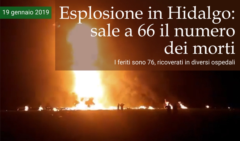 19 gennaio 2019 - Il governatore dello Stato messicano di Hidalgo, Omar Fayad, ha riferito alcuni minuti fa che finora il bilancio delle vittime dell'esplosione dell'oleodotto di Pemex a Tlahuelilpan è di 66 morti e 76 feriti, dei quali 73 uomini e tre donne. In conferenza stampa, Fayad ha informato che i feriti —con lesioni lievi, medie, gravi e molto gravi— sono ricoverati negli ospedali Magdalena de las Salinas, Huichapan, de las Américas, el Sur de Alta Especialidad, Tulancingo, Pemex, IMSS di Tula, Actopan e Zumpango, tra gli altri. (massimo barzizza / puntodincontro.mx)