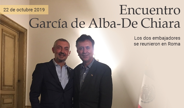 22 de octubre de 2019 - El Embajador de México en Italia, Carlos García de Alba se reunió en Roma con el nuevo Embajador de Italia en México, Luigi De Chiara, a pocas horas de que este último vuele hacia la capital del país latinoamericano para empezar el próximo lunes su misión. «En una poco común y muy afortunada coincidencia», escribió García de Alba en su cuenta de Twitter, «recién llegado a la Embajada de México en Roma, tuve la oportunidad de encontrar y ofrecer una despedida al nuevo Embajador de Italia en México, Luigi De Chiara. Trabajaremos duro compartiendo retos y el firme deseo de acercar aún más a estos dos grandes países». (massimo barzizza / puntodincontro.mx)