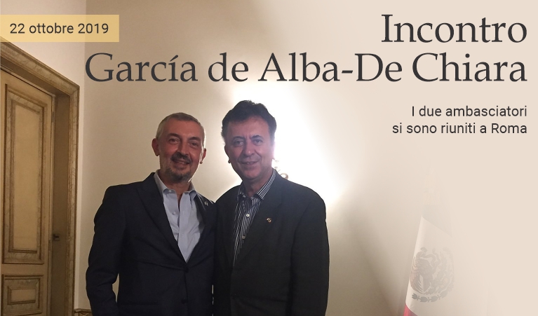 22 ottobre 2019 - L'ambasciatore del Messico in Italia, Carlos García de Alba, ha incontrato a Roma il nuovo Ambasciatore d'Italia in Messico, Luigi De Chiara, poche ore prima che quest'ultimo si trasferisca nella capitale del Paese latinoamericano per iniziare lunedì prossimo la sua missione. «In una poco comune e fortunata coincidenza» —ha scritto García de Alba nel suo account Twitter— «appena giunto all'ambasciata messicana a Roma, ho avuto l'opportunità di incontrare e salutare il nuovo Ambasciatore italiano in Messico, Luigi De Chiara. Lavoreremo incessantemente e condivideremo le sfide e il forte desiderio di avvicinare ancora di più questi due grandi Paesi». (massimo barzizza / puntodincontro.mx)