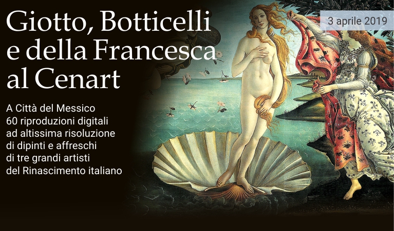 3 aprile 2019 - Il Centro Nazionale delle Arti di Città del Messico (Cenart) —in collaborazione con la Rai-Radiotelevisione Italiana, l'Ambasciata d'Italia in Messico e l'Istituto Italiano di Cultura— presenta fino al 16 giugno la mostra “Opera Omnia, le opere d'arte nell'era della riproduzione digitale II”, che raccoglie 60 immagini in alta risoluzione e dimensioni reali di dipinti e affreschi di tre grandi artisti del Rinascimento italiano: Giotto di Bondone (1267-1337), Piero della Francesca (1412-1492) e Sandro Botticelli (1446-1510). La mostra presenta capolavori del patrimonio culturale italiano esposti in diversi siti il cui valore, monetario e storico, rende impossibile la trasferta. Opera Omnia permette di apprezzare questi pezzi e persino di osservare i minuscoli dettagli generati dal passare del tempo negli originali, che in molti casi è difficile percepire nei musei. Opera Omnia è la continuazione di “Leonardo, Rafaello e Caravaggio: una mostra impossibile”, esposizione che nel 2015 attirò gratuitamente per 94 giorni al Cenart oltre 180 mila visitatori. In questa nuova presentazione, l'obiettivo è quello di diffondere l'importanza delle opere esposte e proporre una riflessione sul Rinascimento e la sua influenza sulla storia della civiltà e dell'arte. Questo movimento, emerso nell'Europa occidentale, si sviluppò dalla fine del XIII al XVI secolo e fu caratterizzato da un notevole sviluppo della cultura, della scienza e della filosofia umanista, mentre nell'arte prevalevano gli ideali classici, la ricerca della bellezza, dell'equilibrio e dell'armonia. Giotto di Bondone, Piero della Francesca e Sandro Botticelli sono tre artisti rappresentativi di questo periodo, che segna la fine dell'epoca medievale e l'inizio dell'era moderna. Giotto è un esempio di questa transizione, le sue opere mostrano un linguaggio figurativo e un primo approccio alla nozione della prospettiva, perfezionata più avanti dai suoi successori. Piero della Francesca si erge a trasmettitore dei valori classici e nei suoi dipinti evidenzia tratti profondamente religiosi che si adattano consapevolmente ai vecchi modelli, mentre Botticelli è un simbolo della pittura italiana del XV secolo, con una grande padronanza dell'armonia e della prospettiva abbinate a riferimenti alla mitologia greco-romana, divenuti nei secoli successivi una delle sue principali caratteristiche distintive. La mostra Opera Omnia può essere visitata dal martedì alla domenica dalle 10:00 alle 17:30. L'ingresso è gratuito. Per ulteriori informazioni, tra cui il programma di visite guidate ed altre attività complementari, consultare http://operaomnia.cenart.gob.mx (massimo barzizza / puntodincontro.mx)