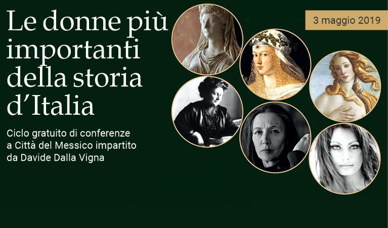 3 maggio 2019 - Inizia, da domenica prossima, il ciclo gratuito di conferenze Le donne più importanti della storia d'Italia che sarà tenuto in spagnolo da Davide Dalla Vigna, docente dell'Istituto Italiano di Cultura di Città del Messico, presso il Museo de la Mujer, República de Bolivia 17, nel Centro Storico della capitale. Ad ogni sessione verranno presentate le biografie di cinque membri del gentil sesso che hanno segnato la storia dello Stivale e, in alcuni casi, anche dell'Europa e del mondo. Le loro vite e opere verranno descritte in base ad aspetti inerenti alla storia dell'arte, la scienza, la pedagogia, la musica, il cinema, la moda e lo sport. Il programma comprende un totale di 30 personaggi, le cui storie spaziano dal periodo dell'Impero Romano (27 aC - 476 dC) all'era contemporanea (XX e XXI secolo). Il ciclo si propone di sottolineare il ruolo centrale delle donne nella storia, nonostante le difficoltà e gli ostacoli imposti al loro sviluppo personale e professionale dal sistema patriarcale che ha prevalso nel corso dei secoli. Le sessioni si terranno secondo il seguente programma:
