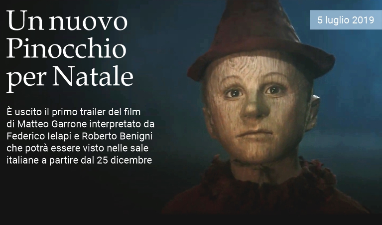 5 luglio 2019 - È stato pubblicato il primo trailer di Pinocchio, nuova versione cinematografica del celebre romanzo del 1883 di Carlo Collodi, questa volta girata dal regista italiano Matteo Garrone. Il burattino è interpretato da Federico Ielapi, mentre Geppetto è Roberto Benigni (che aveva già presentato al pubblico un suo lungometraggio sullo stesso argomento nel 2002). Nel cast anche Marine Vacht, Gigi Proietti, Rocco Papaleo, Massimo Ceccherini e Marcello Fonte. Pinocchio uscirà nei cinema italiani il 25 dicembre.