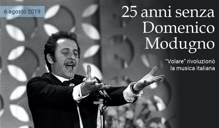 6 agosto 2019 - Venticinque anni senza Domenico Modugno. Mr. Volare, come lo conosceva mezzo mondo, è morto il 6 agosto del 1994, a soli 66 anni. Era un caldo pomeriggio d'estate, davanti ai suoi occhi che si sono chiusi per l'ultima volta c'erano l'amato mare di Lampedusa e il tramonto. Già provato da tempo nel fisico, lasciò un segno indelebile nella musica italiana, ma non solo. Portò il “bel canto”, il talento e il fascino del Bel Paese dove nessuno si era mai spinto fino a quel momento: Nel blu dipinto di blu, che tutti —indistintamente— hanno cominciato a chiamare Volare, è diventato una sorta di inno nazionale.