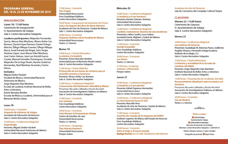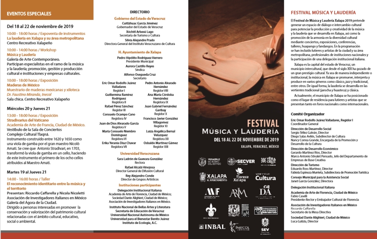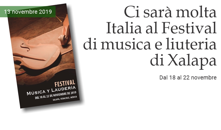 13 novembre 2019 - Dal 18 al 22 novembre si svolgerà a Xalapa il Festival di musica e liuteria 2019, evento che mira a creare uno spazio di dialogo e scambio culturale per migliorare la produzione e la creatività nei campi della musica e della liuteria in questa città, capitale dello Stato di Veracruz, nonché promuovere l'armonia nella diversità culturale attraverso concerti, mostre, conferenze, seminari, huapangos e fandangos. Nel programma sono stati inclusi liutai e artisti di Xalapa e dintorni, professionisti di istituzioni nazionali e la partecipazione di una delegazione istituzionale italiana di cui faranno parte Fabio Caselli, presidente e rettore dell'Academia de Arte de Florencia (AAF), Luca Galizia, direttore della Società Dante Alighieri di Città del Messico, Gianluca Brocca, presidente del Comites messicano, Marco Marica, direttore dell'Istituto italiano di cultura, Emilia Giorgetti, addetta scientifica dell'Ambasciata d'Italia in Messico, Paolo Malfitano, direttore di progetti all'Agenzia ITA / ICE di Città del Messico, Riccardo Caffarella, membro dell'Associazione dei ricercatori italiani in Messico, e Massimo Barzizza, direttore di Puntodincontro. Il Bel Paese parteciperà con un concerto della violoncellista Nadege Rochat, interpretato con un cello Stradivari di proprietà dell'AAF che sarà esposto per due giorni, una mostra —fino alla fine di gennaio 2020— delle opere del pittore fiorentino Mario Minarini, conferenze magistrali e seminari. Il Messico possiede una grande diversità culturale, arricchitasi nel corso della storia. La sua identità si basa sulle popolazioni originali, afro-discendenti, europee ed altri movimenti migratori. Il porto e la città di Veracruz furono l'ingresso principale della la Nuova Spagna, ma sono contemporaneamente luoghi tipicamente caraibici, per cui fin dal XVI secolo appartengono a un interessante circuito di interscambio culturale. Xalapa è un municipio il cui nome deriva dalla parola nahuatl xailapan, che significa sorgente nella sabbia. Alexander von Humboldt la chiamò “Città dei fiori” e, dal XIX secolo, gode di un grande prestigio a causa delle varie istituzioni che vi sono state fondate, motivo per cui è anche conosciuta come l'“Atene dello Stato di Veracruz”. In modo indipendente o in contesti istituzionali, la musica a Xalapa viene prodotta, interpretata e promossa in vari generi, tra cui quello classico, il jazz e le composizioni tradizionali. Allo stesso modo, la liuteria si sviluppa lungo diversi percorsi: si costruiscono principalmente jaranas —strumenti a corde dotati di tasti, con un corpo più stretto di una chitarra a causa della loro discendenza diretta dalla chitarra barocca spagnola del XVI secolo—, guitarras de son —strumenti a quattro o cinque corde pizzicate, suonati solitamente con un plettro—, quintas huapangueras —strumenti ritmici, simili a una chitarra, caratterizzati da un grande corpo risonante con un collo corto—, leonas —strumenti percussivi a 4 corde che svolgono la funzione del basso— ed arpe, oltre a chitarre classiche e strumenti ad arco (violini, viole, violoncelli e contrabbassi). Attualmente, il municipio di Xalapa è un territorio culturale per la creatività, l'espressione artistica e lo sviluppo professionale e si è posizionato come luogo di residenza di liutai e artisti che si presentano in forum nazionali e internazionali. (massimo barzizza / puntodincontro.mx)